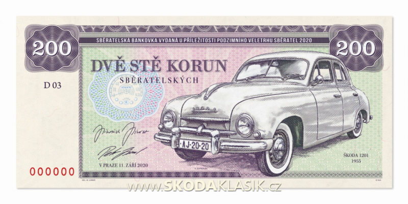 Hlavním motivem nové bankovky, tentokrát v nominální hodnotě „200 sběratelských korun“, je český automobil Škoda 1201 z roku 1955. Na rubové straně je vedle pražských věží portrét Václava Zapadlíka. Tento motiv již zůstane shodný pro všechny podzimní emise hodnot „200 sběratelských korun“, stejně tak jako motiv pražských mostů bude shodný pro jarní emise všechny o hodnotách „100 sběratelských korun“.