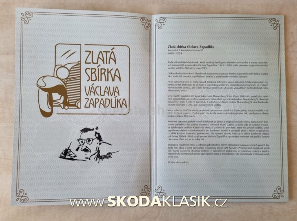 První bankovka série 01 emitovaná v roce 2019 měla náklad 300 kusů. Ohromný zájem sběratelů tehdy organizátory veletrhu ale tak překvapil, že se motiv s vozem Duesenberg SJ rozhodli pod označením „II. vydání“ emitovat ještě jednou, aby i další fandové mistrovství „Maestra Zapadlíka“ mohli dosbírat celou plánovanou emisi.