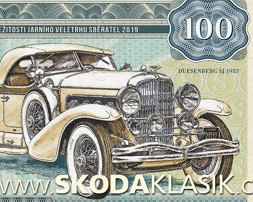Hlavním motivem první bankovky je vůz nejoblíbenější automobilové značky Václava Zapadlíka Duesenberg, konkrétně model SJ z roku 1933 a má nominální hodnotu 100 „sběratelských korun“. Automobily domácí výroby, které vyjdou v budoucích řadách, budou mít nominální hodnotu 200 Kč.