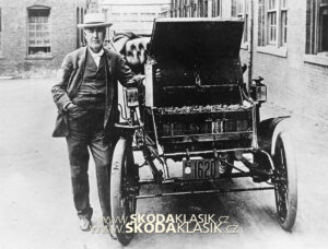 Thomas Edison pózuje se svým prvním elektrovozem, kterým je Edison Baker.