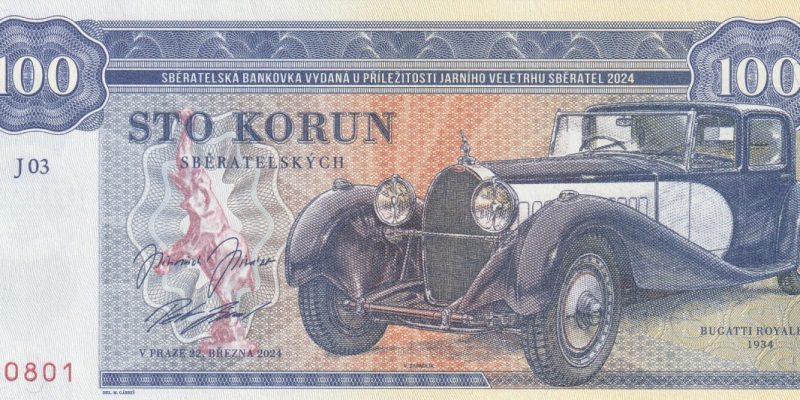 Vyšla nová sběratelská bankovka ze série „Zlatá sbírka Václava Zapadlíka“. Je věnována legendární automobilu BUGATI Royale 41 v celkovém počtu 3 000 kusů, rozdělených opět do sérií 01 až 03.