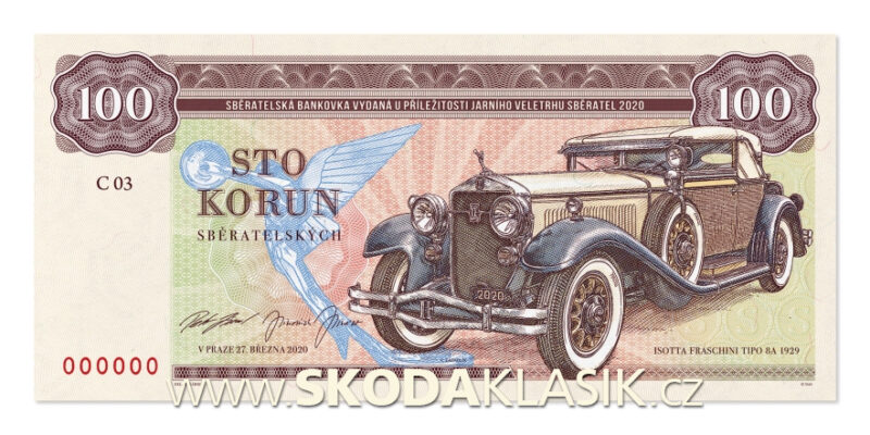 Sběratelská bankovka 100 korun Isotta Fraschini Tipo 8A z roku 1929 navazuje na předchozí bankovky s motivy Duesenberg SJ (Sběratel jaro 2019) a Škoda 860 (Sběratel podzim 2019).