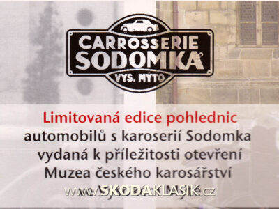 Představujeme vám limitovanou edici pohlednic automobilů s karoserií SODOMKA, vydanou u příležitosti otevření Muzea českého karosářství ve Vysokém Mýtě Karoserie SODOMKA