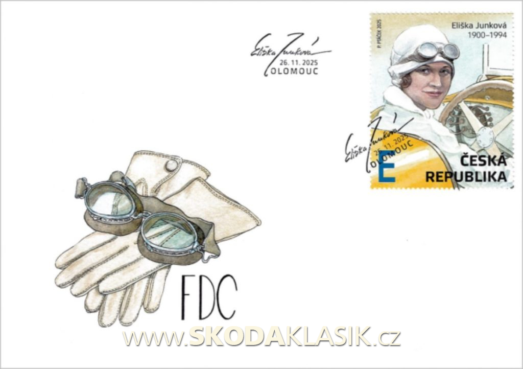 Česká pošta vydala aršík věnovaný naší nejlepší automobilové závodnici Elišce Junkové a jeho grafické ztvárnění zadala malíři Petru Ptáčkovi.