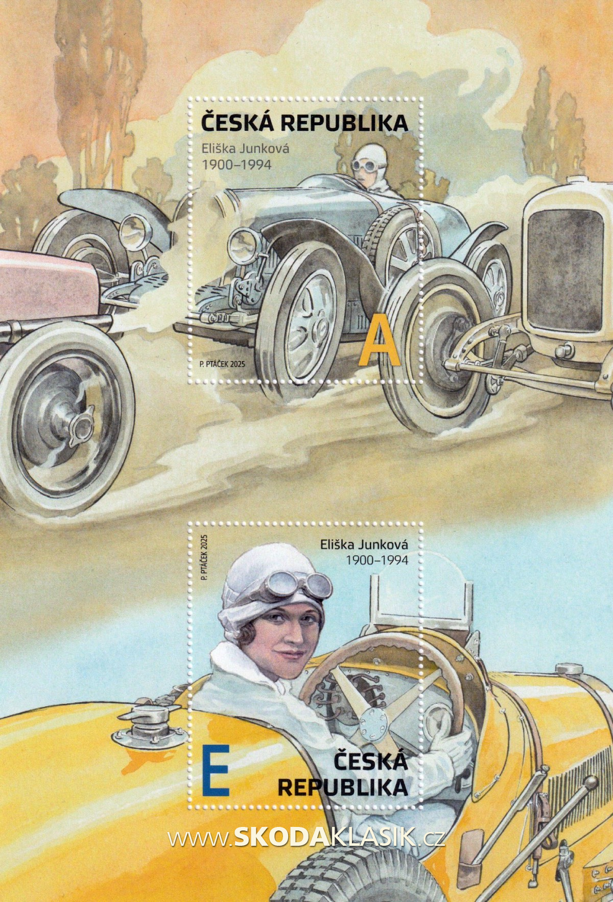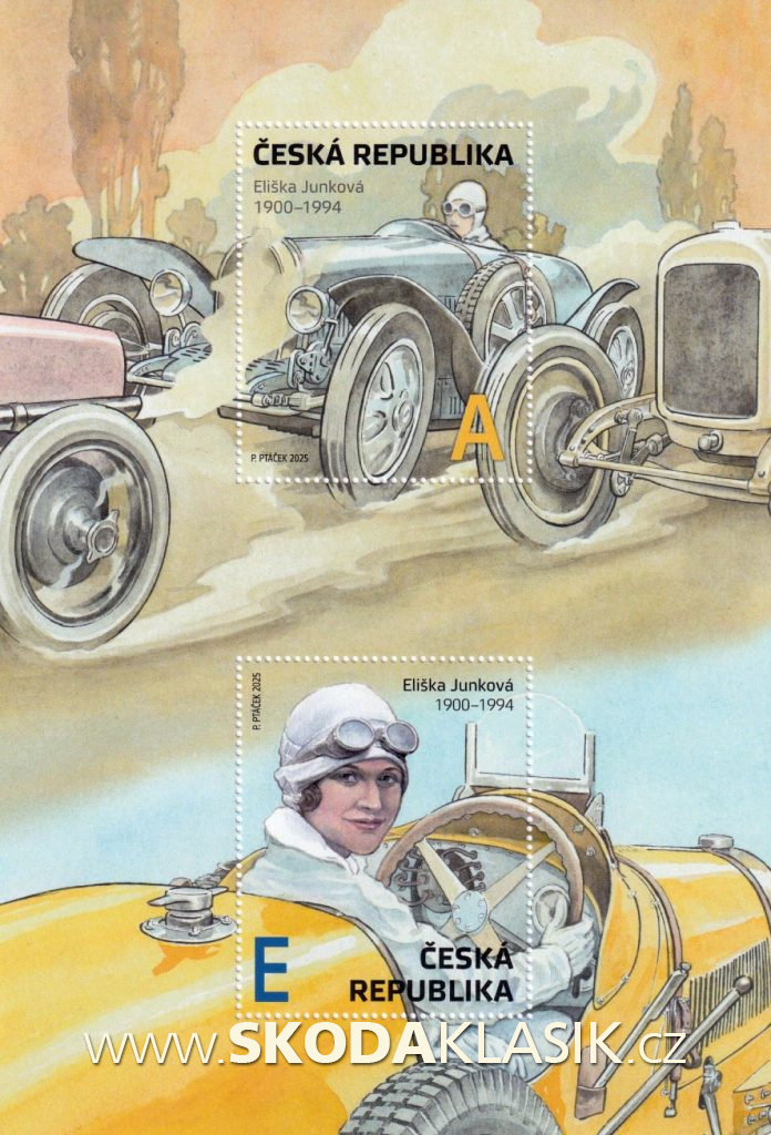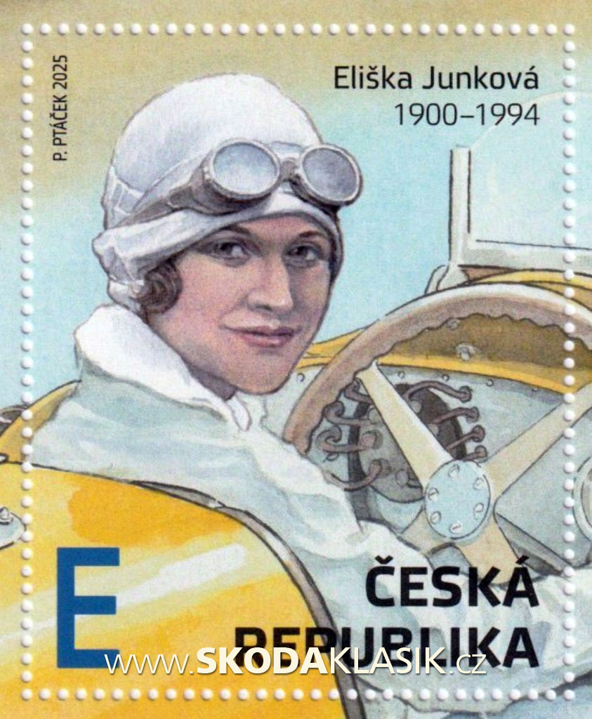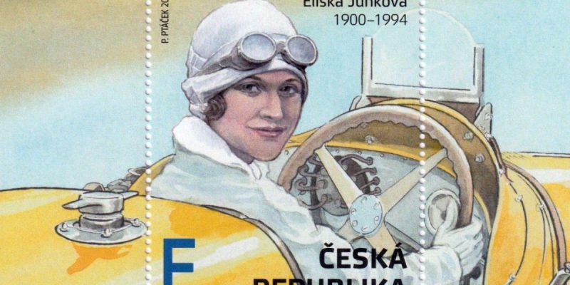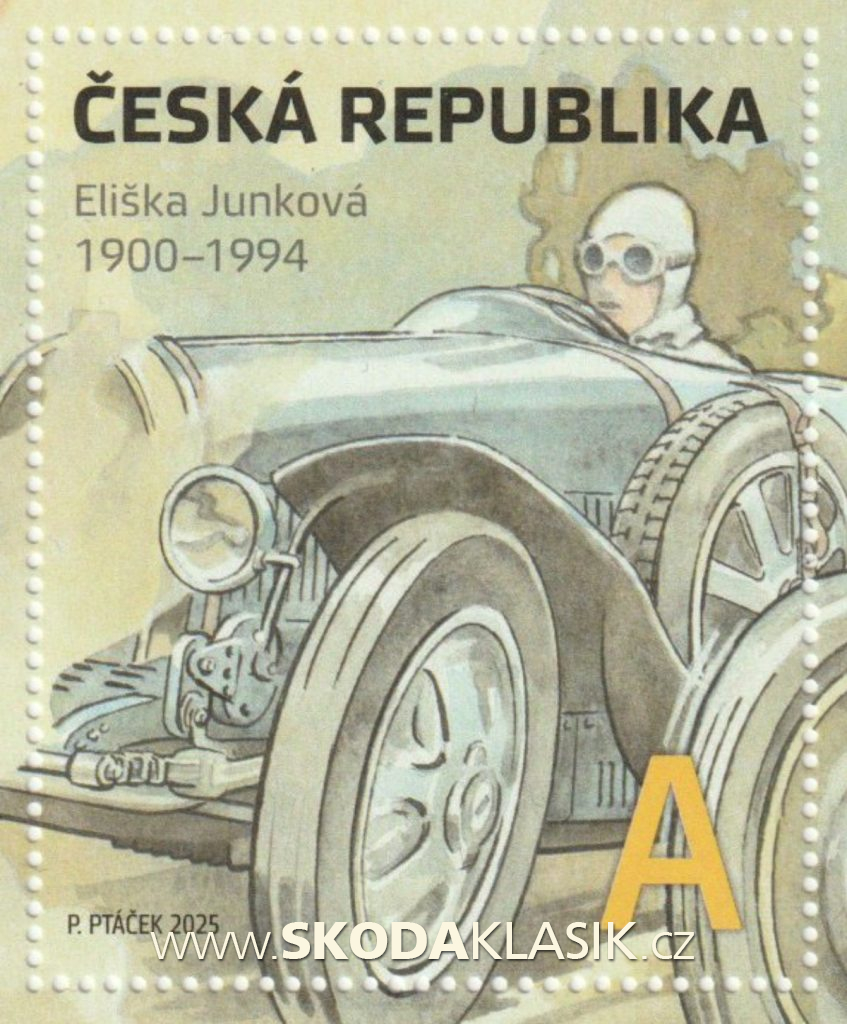 Česká pošta vydala aršík věnovaný naší nejlepší automobilové závodnici Elišce Junkové a jeho grafické ztvárnění zadala malíři Petru Ptáčkovi.