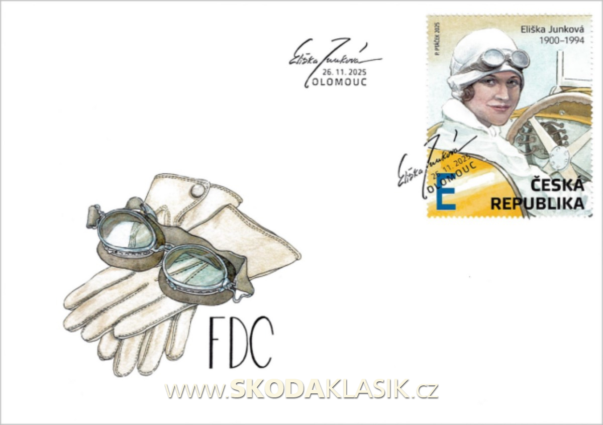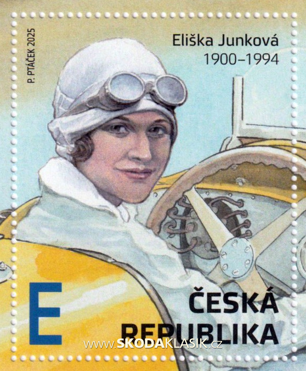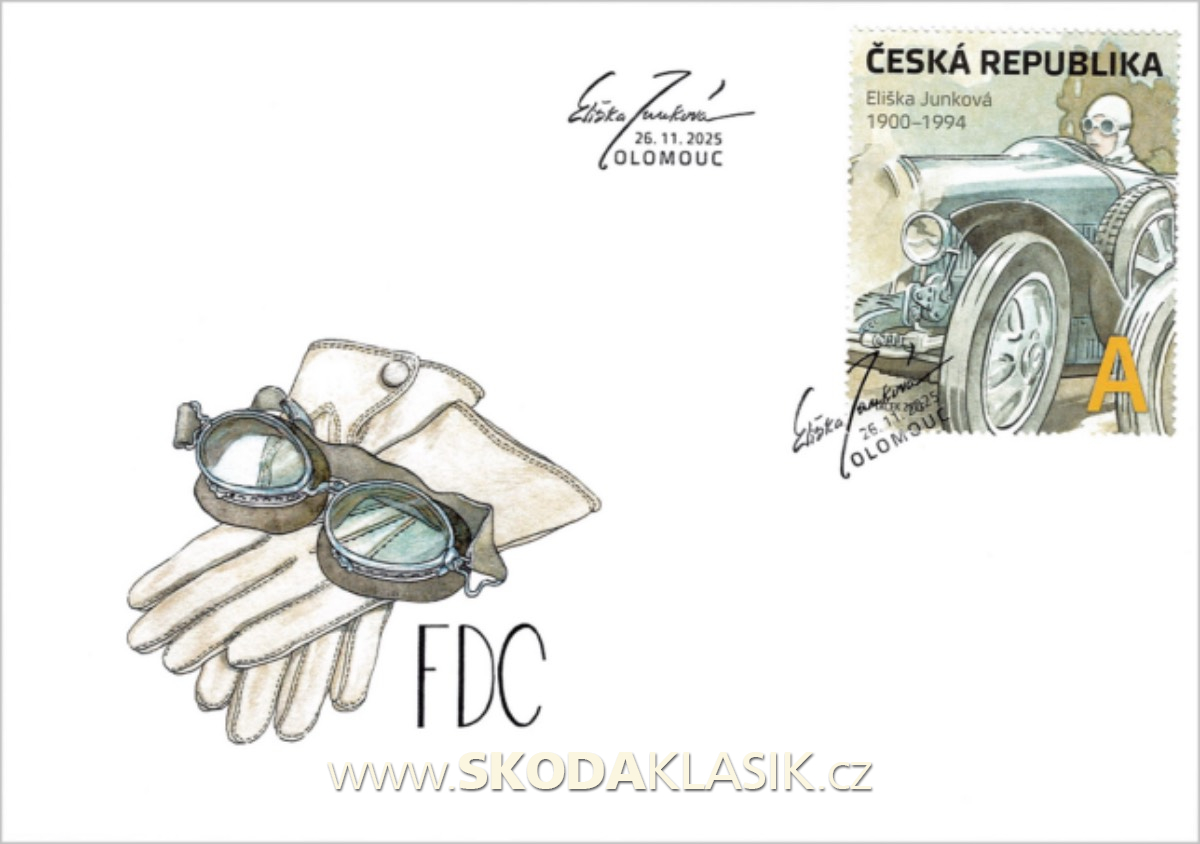 Česká pošta vydala aršík věnovaný naší nejlepší automobilové závodnici Elišce Junkové a jeho grafické ztvárnění zadala malíři Petru Ptáčkovi.